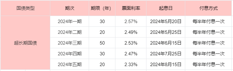2024年三期,期限50年,票面利率2.53%;2024年四期,期限30年,票面利率2.47%;