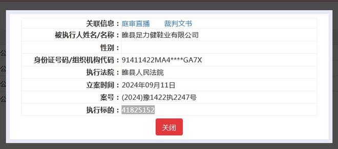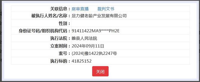 中国执行信息公开网显示,9月11日,足力健老龄产业发展有限公司、睢县足力健鞋业有限公司新增被执行信息,执行标的均为41825152元,执行法院为睢县人民法院。