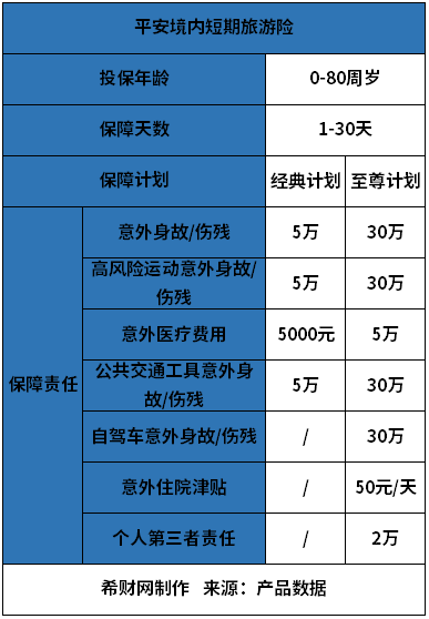 平安境内短期旅游险是针对于境内的产品,保额高,单项保障高达30万;保障全面,意外伤害可以赔付;性价比高,对于经典计划,一天还不到1元钱。