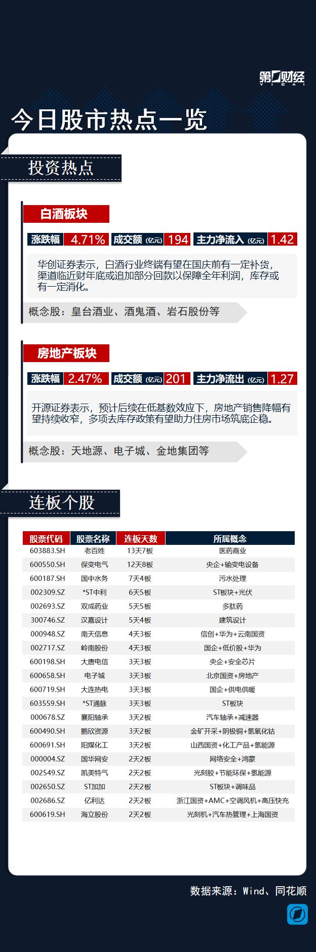 板块方面,白酒板块大涨,华创证券表示,白酒行业终端有望在国庆前有一定补货,渠道临近财年底或追加部分回款以保障全年利润,库存或有一定消化;房地产板块表现活跃,开源证券表示,预计后续在低基数效应下,房地产销售降幅有望持续收窄,多项去库存政策有望助力住房市场筑底企稳。