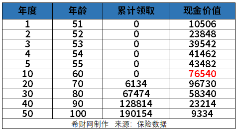 从表中可以看到,70岁每年可以领取6134元,领取10年达到67474元,领取养老金已经大于所交保费;100岁累计养老金加上账户的现金价值达到199488元。