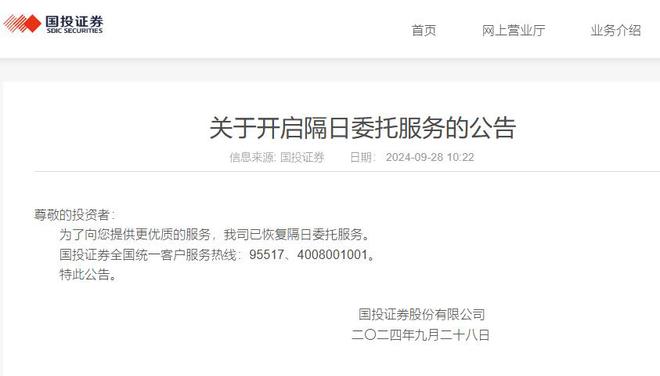 【国投证券恢复隔日委托服务】国投证券发布公告称,已恢复隔日委托服务。此前,包括国投证券、广发证券、国海证券在内的多家券商齐发公告称,9月27日起暂时关闭隔日委托功能,隔日委托功能开启的具体时间,将另行通知。(中新经纬APP)