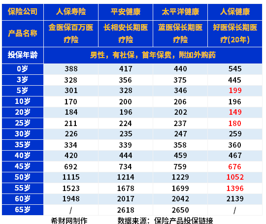 从本质上看,如果是有社保的情况下,和同类产品对比,可以看出哪款产品更友好,交费更低,虽然百万医疗险交费大差不差的,我们选择有社保版本,附加了院外特药保障进行保费对比,以市场上男性,有社保,首年保费,附加外购药对比而言,选择了人保寿险金医保百万医疗险、平安健康长相安长期医疗险、太平洋健康蓝医保长期医疗险、人保健康好医保长期医疗(20年)为例,保证续保20年的产品,对比看看: