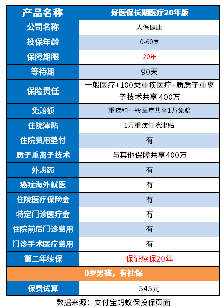 其实查看一款百万医疗险的优势,第一步就是看基础保障,包括投保年龄是否广泛、保障责任是否全面、续保是否稳定、免赔是否好等,我们看支付宝好医保优缺点分析也是如此,拿好医保长期医疗险20年版为例:
