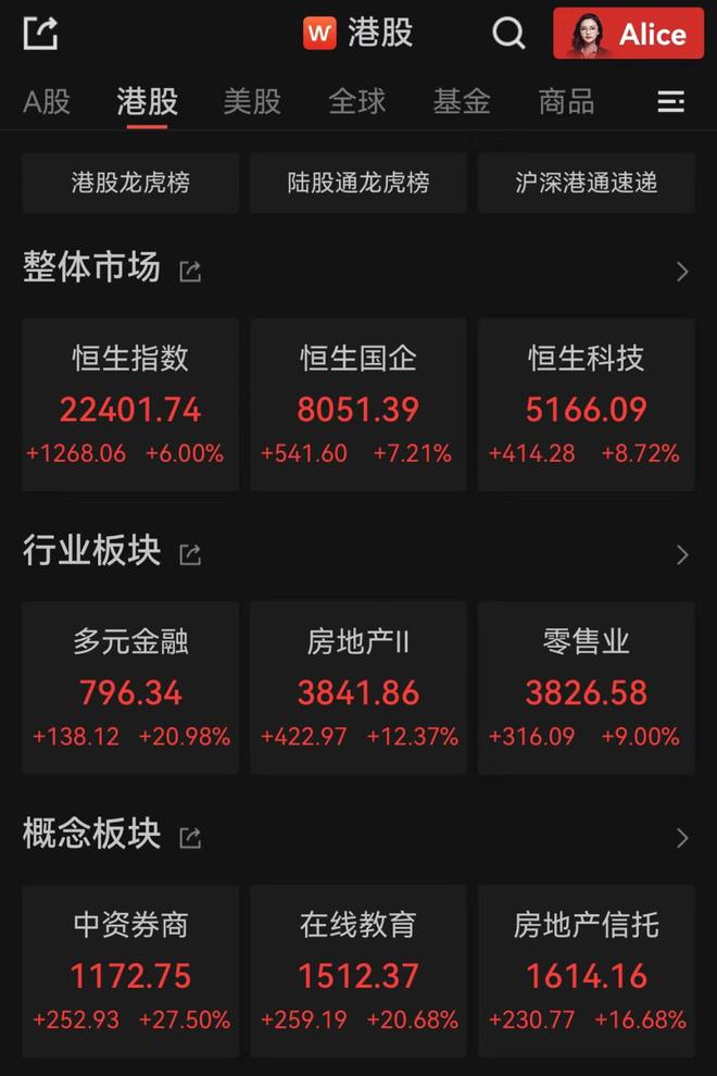 截至午间收盘,港股三大指数放量大涨,恒指涨6%,刷新2023年1月以来高位,报22401.74点;恒生科技指数涨8.72%,创2022年2月以来新高,报5166.09点。恒生国企涨7.21%,报8051.39点。大市半日成交额2354亿港元。