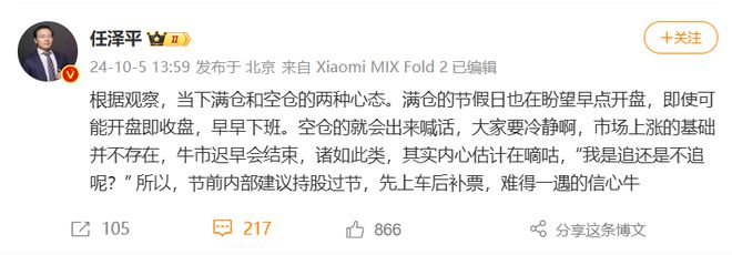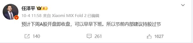著名经济学家任泽平发文称,预计下周A股开盘即收盘,可以早早下班,所以节前内部建议持股过节 。新浪证券解读称,很明显,就是预测下周A股开盘就全部封死涨停板,直接就收盘了!
