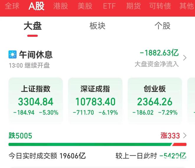 10月9日早盘,三大指数集体低开,截至午间休盘,沪指报3304.84点,跌5.30%;深证成指报10783.40点,跌6.19%;创业板指报2364.26点,跌7.29%。沪深京三市早盘成交量达1.96万亿元,较上一日放量减少5420亿元;全市超5000只个股下跌,约3500只个股跌超7%。
