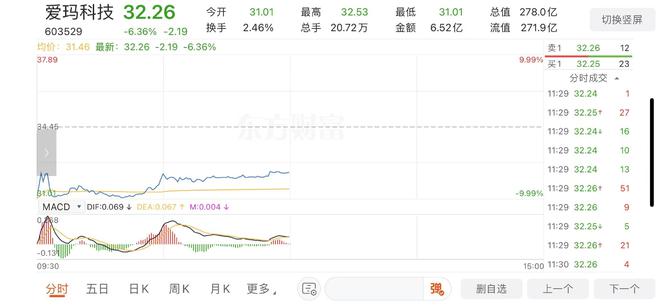 10月11日,爱玛科技股价开盘大跌,盘中一度跌超9%。截至午间收盘,跌6.36%,收于32.26元。总市值278亿元,较昨日收盘总市值缩水了18.9亿元。