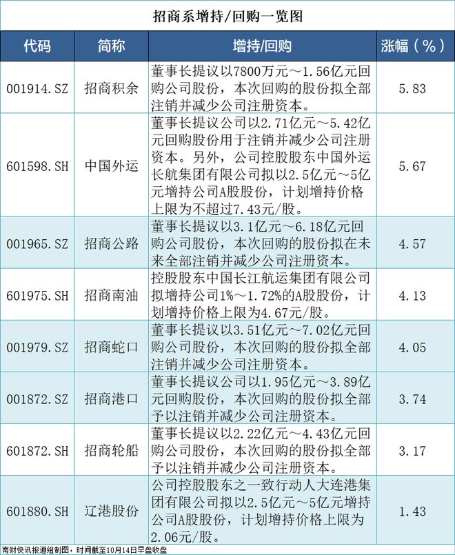 10月14日早间,招商局集团旗下8家上市公司披露了回购或增持计划公告。