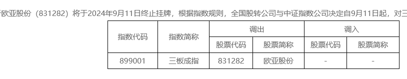 鉴于荷普医疗(839926)将于2024年10月15日终止挂牌,根据指数规则,全国股转公司与中证指数公司决定自10月15日起,对三板成指的样本股做出如下调整: