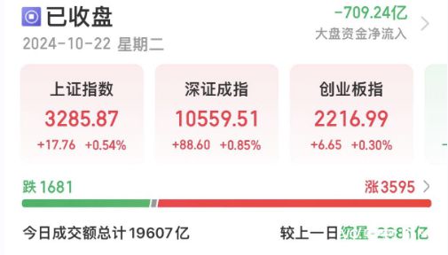 10月22日,A股三大指数集体收涨,截至收盘,沪指报3285.87点,涨0.54%;深成指报10559.51点,涨0.85%;创业板指报收2216.99点,涨0.3%。此外,北证50指数回调,跌7.6%,报收1159.89点。