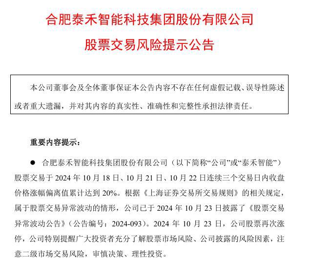 23日,“三连板”泰禾智能发布股票交易风险提示公告。泰禾智能表示,公司关注到“溢价101%入主泰禾智能,阳光电源买壳背后藏何资本谋划”等相关报道,经向阳光新能源核实,阳光新能源确认不存在未来12个月内改变公司主营业务,进而导致公司主营业务发生根本变化的计划。