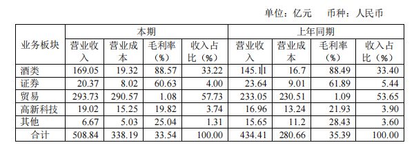 财务数据显示,泸州老窖集团2024年上半年实现营收508.84亿元,同比增长17.13%;实现利润总额113.40亿元,同比增长5.74%;集团业务主要包括四大板块:酒类板块、证券板块、贸易板块以及高新科技板块。