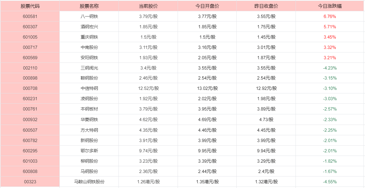 600581八一钢铁,当前股价3.79元/股,涨幅6.76%;600307酒钢宏兴,当前股价1.85元/股,涨幅5.71%;