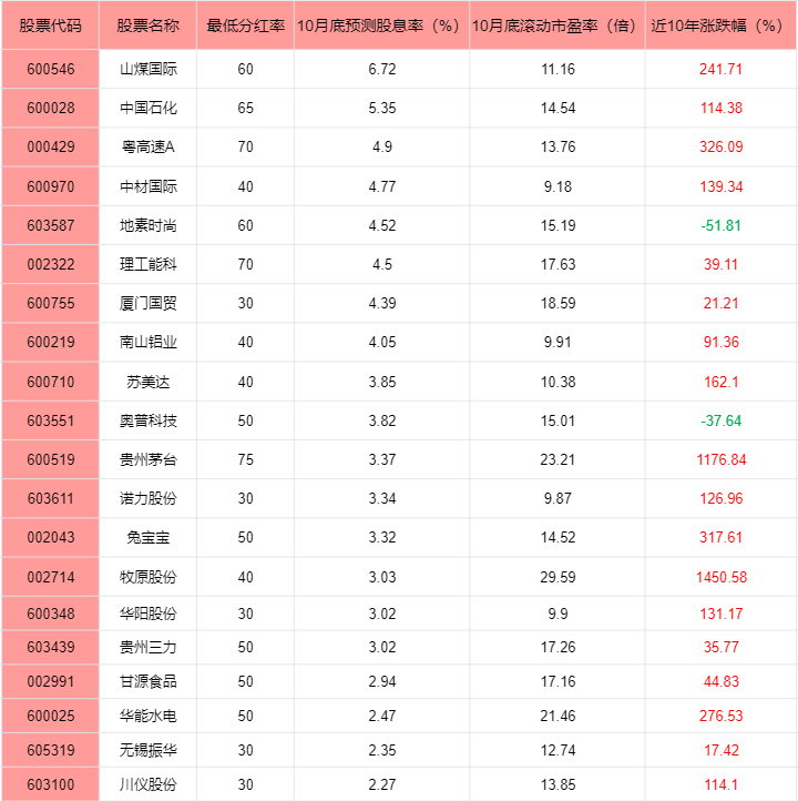 002043兔宝宝,最低分红率50%;002714牧原股份,最低分红率40%;600348华阳股份,最低分红率30%;