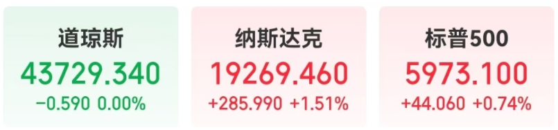 1、美股三大指数收盘涨跌不一,纳指上涨285.99点,涨幅1.51%;标普500涨0.74%;道指平收。其中,纳指、标普500指数均续创历史收盘新高。