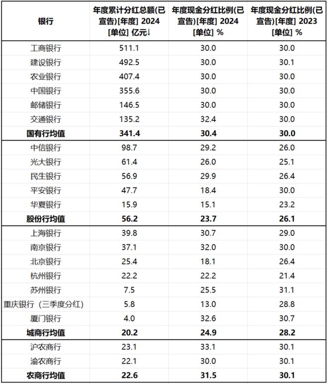 此外,民生银行、苏州银行已分别宣告于11月13日、18日进行派息;工商银行、农业银行、邮储银行、中国银行、渝农商行将于2025年1月先后派息。
