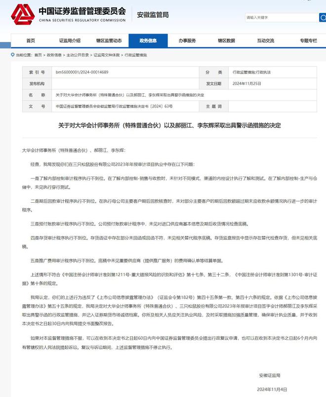 具体来看,经查,安徽证监局发现大华所、郝丽江、李东辉在三只松鼠股份有限公司2023年年报审计项目执业中存在以下问题: