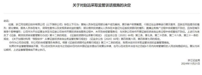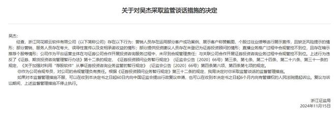 浙江证监局称,经查,同花顺云软件公司存在以下行为:营销人员存在运用部分客户成功案例、展示客户称赞截图、个股过往业绩等进行展示宣传,且缺乏风险提示的情形;部分营销、服务人员存在夸大、误导性宣传以及变相承诺收益的情形;部分提供投资建议人员存在未登记为证券投资顾问的情形;直播业务推广过程中合规管控不到位,且存在暗示推荐个股等情形;公司作为平台运营主体在与证券公司合作开展投资咨询服务过程中,未尽到合规管理责任;与关联公司合作开展证券投资咨询业务过程中合规管控不到位。