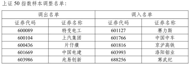其中,上证50指数更换5只样本,赛力斯、中国中车、京沪高铁、洛阳钼业、寒武纪调入,特变电工、上汽集团、片仔癀、中国电建、兆易创新调出。上证180指数更换18只样本,上证380指数更换38只样本,科创50指数样本无变动。