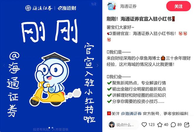 中泰证券也在同日正式入驻小红书,称“别看俺们来得晚!咱可是知名的!经典的!老牌的!有口皆碑的券商公司!”中泰证券还表示,“后续咱也会动用最大的力量为大家挖来咱家的明星投顾、基金经理、行业大咖,甚至经济学家!为大家提供有趣又高端的财经知识!”
