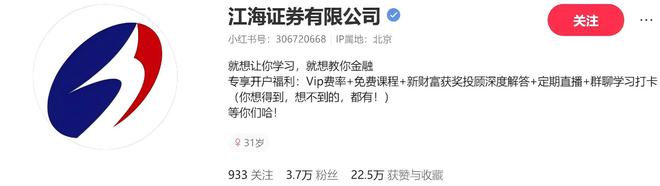 其中,粉丝量超过1万的券商小红书账号主要有江海证券(3.7万)、中金财富(2.1万)、“招商证券财经社牛养成记”(2万)、国金证券(1.8万)、“中信建投融资融券”(1.7万)、平安证券(1.3万)。以目前粉丝量最多的江海证券为例,其自2022年就入驻了小红书,获赞与收藏数为22.4万。除主账号之外,江海证券还孵化了粉丝数量可观的多个矩阵账号,如“江海财鲸证券”(2.5万)、投顾号“我的作业本”(8.4万)等。