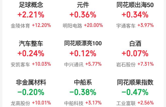 板块题材上,足球概念、汽车整车、白酒板块涨幅居前;教育、影视院线、大消费方向跌幅居前。