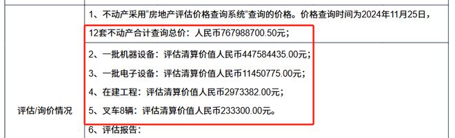 其中,12套不动产评估价值约7.68亿元,一批机器设备评估价值约4.48亿元,两项合计就逾12亿元。此外,还包括一批电子设备、在建工程、叉车8辆。