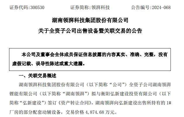 近日,湖南领湃科技集团股份有限公司(以下简称“领湃科技”)发布公告称,旗下全资子公司湖南领湃拟与弘新建设签订《资产转让合同》,向后者出售所持有1#厂房的部分配套动辅设备,交易价格4874.68万元。