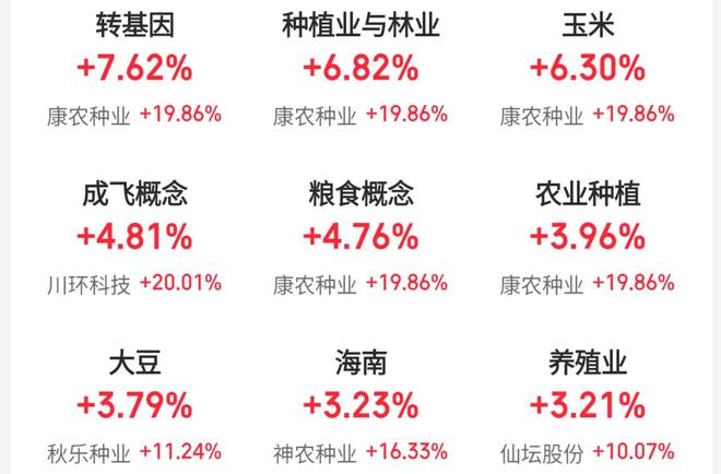 零售股反复活跃,东百集团(600693)、中百集团(000759)、国芳集团(601086)、武商集团(000501)涨停。农业板块午后走强,敦煌种业(600354)、隆平高科(000998)、万向德农(600371)、丰乐种业(000713)涨停,荃银高科(300087)、神农种业(300189)涨超10%。按照往年惯例,每年年初将发布聚焦三农问题的中央一号文件。中国银河指出,农业板块整体估值处历史相对低位区间,关注政策密集期机会。