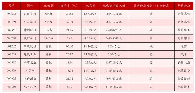 截至12月31日收盘,上证综指下跌1.63%,收于3351.76点,深证成指下跌2.4%,收于10414.61点,创业板指下跌2.93%,收于2141.6点。今日沪深两市A股共计58只涨停,综合当前连板数以及当日龙虎榜数据,其中较为强势的前三只个股分别为:东百集团(600693)、中百集团(000759)与神剑股份(002361)。今日强势个股前10位具体数据见下表: