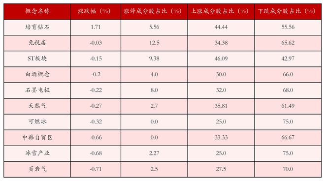根据A股概念涨跌幅与所对应的股票池综合分析,涨幅靠前的三个概念板块分别为:培育钻石、免税店与ST板块。排名前10位的概念板块相关数据见下表:
